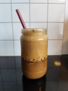 Setjið kaffið, sykurinn, ísmola og vatn í krukku eða ferðafólks og hristið hraustlega í 1-2 mínútur. Bætið svo við mjólk eftir smekk, ég nota möndlumjólk eða haframjólk
